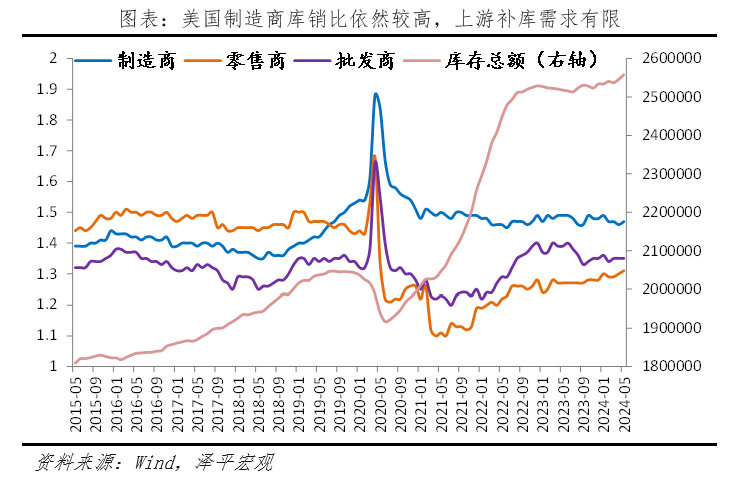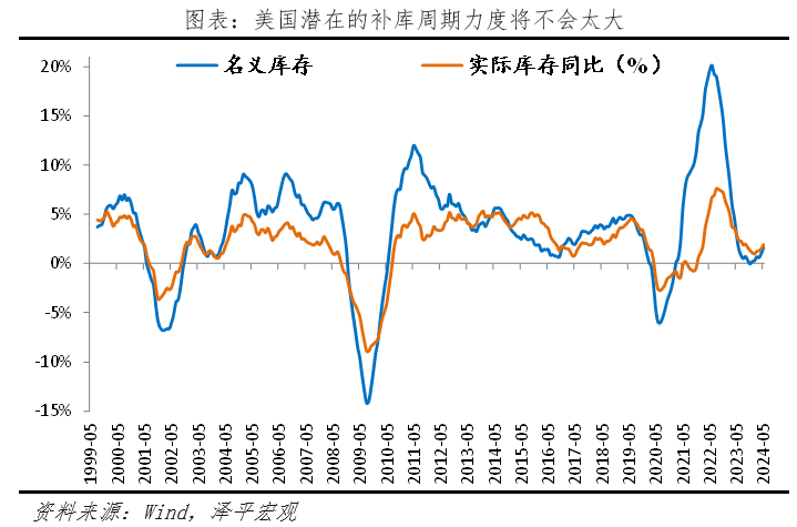 1)美國經(jīng)濟出現(xiàn)三點放緩信號,但著陸方式尚不確定。一是當前美國家庭儲蓄率出現(xiàn)下滑,高水平的消費支出可能在長期內(nèi)難以持續(xù);二是長期高利率下,需求不足、新屋開工率下滑,拖累住宅投資和建筑投資。三是補庫周期較弱,從名義庫存的角度看,美國庫存去化較快。但高通脹導(dǎo)致以名義庫存視角判斷補庫力度(涵蓋工業(yè)品價格與工業(yè)品數(shù)量需求)在當前指導(dǎo)意義較差。若從實際庫存來看,美國本輪去庫程度較為有限,本輪補庫強度可以參考2016年底的補庫周期,整體力度不會太大,更多的是行業(yè)層面的結(jié)構(gòu)性補庫。