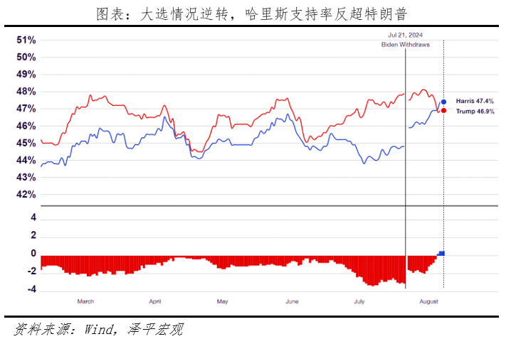 3)美國大選選情膠著,但候選人對華遏制態(tài)度不變。7月拜登退選,哈里斯迎來政治蜜月期,民調(diào)支持率反超特朗普,但選舉人票數(shù)仍落后于特朗普,選舉局勢不確定性較強。我們曾在《美國大選展望:特朗普會否重返白宮及影響》中設(shè)想兩種情景:一種是特朗普當選,美國將通脹再起、利率維持高位,逆全球化,可能引起美國再通脹、提高關(guān)稅,惡化盟友關(guān)系。另一種情形是哈里斯當選,主張團結(jié)盟友、支持創(chuàng)新、上調(diào)最低工資、保護薪水福利、醫(yī)改、接受難民等,預(yù)計將聯(lián)合盟友向中國施壓。但對華政策方面,無論誰當選預(yù)計都將保持遏制態(tài)度。