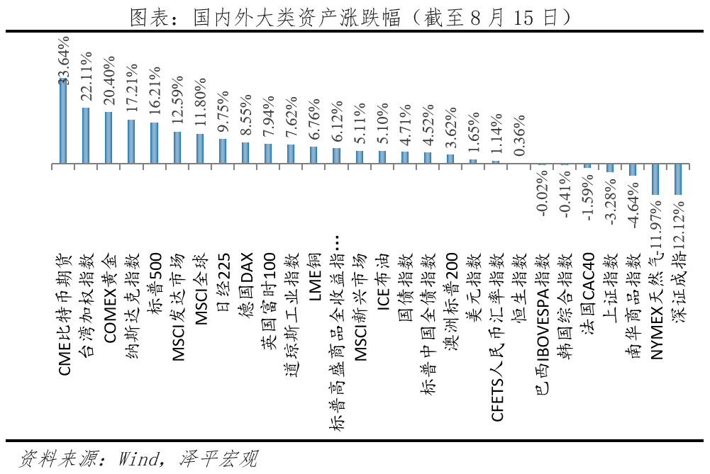 2024年初以來大類資產(chǎn)走勢分化,海外資產(chǎn)表現(xiàn)整體優(yōu)于國內(nèi)市場。海外市場權(quán)益市場領(lǐng)漲。2024年初至815日,WIND全球股票上漲12.70%,其中發(fā)達市場13.50%,新興市場5.95%,美歐漲幅靠前。標普商品指數(shù)5.95%,其中貴金屬、能源、軟商品兩位數(shù)漲幅領(lǐng)漲。國內(nèi)市場,債市走牛、權(quán)益復(fù)蘇乏力。截至815日,上證指數(shù)-3.28%WIND境內(nèi)債券上漲4.54%,人民幣匯率指數(shù)1.1394%,小幅走強,南華商品指數(shù)-3.59%。上半年表現(xiàn)較好的資產(chǎn)有三類,一是以去美元化、避險屬性為主的比特幣和黃金;二是供給因素推動的原油,全球制造業(yè)復(fù)蘇邏輯的有色金屬類大宗品;三是價值風(fēng)格的日本股市、AI浪潮的美國科技股等。