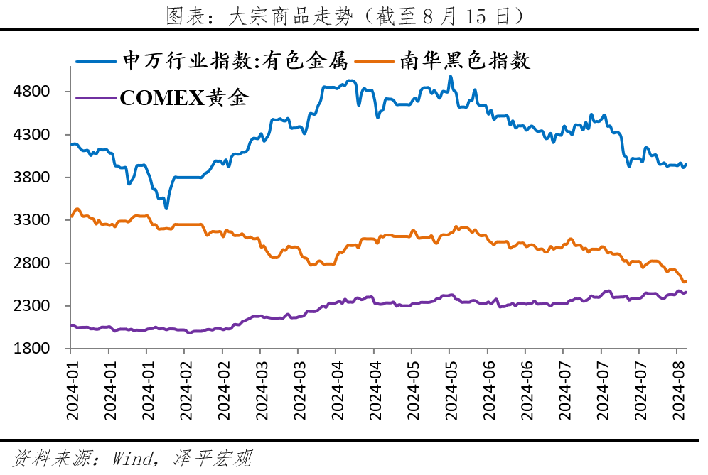 美國經(jīng)濟降溫是大勢所趨,但難言衰退或硬著陸,海外交易主線仍是降息交易。當前市場基本定價9月美聯(lián)儲開啟降息,一是利好新興市場股市。美債利率走弱,一定程度引導(dǎo)資本外流,利好新興市場股市。二是黃金短期可能利好出盡,但長期配置基礎(chǔ)仍在。在美聯(lián)儲降息落地后,當前黃金漲幅已充分定價美聯(lián)儲降息預(yù)期,但美國大選可能釋放美國債務(wù)進一步增長的信號,增加市場對美元信用的擔憂,因此黃金長期配置邏輯仍在。