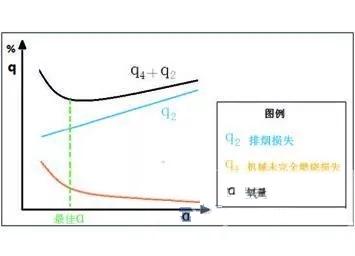 鍋爐的燃燒效率與鍋爐的氧含量有直接的關系,在散熱損失與灰渣顯熱損失相對不變的情況下,如果氧量過低,排煙損失q2雖然較低,但是機械未完全燃燒損失q4卻很高,總體效率還是較低。如果氧量過高,排煙損失q2明顯增高,即使機械未完全燃燒損失q4較低,但是總體效率依然較低,具體氧含量與鍋爐效率損失可用圖4所示的曲線表達。