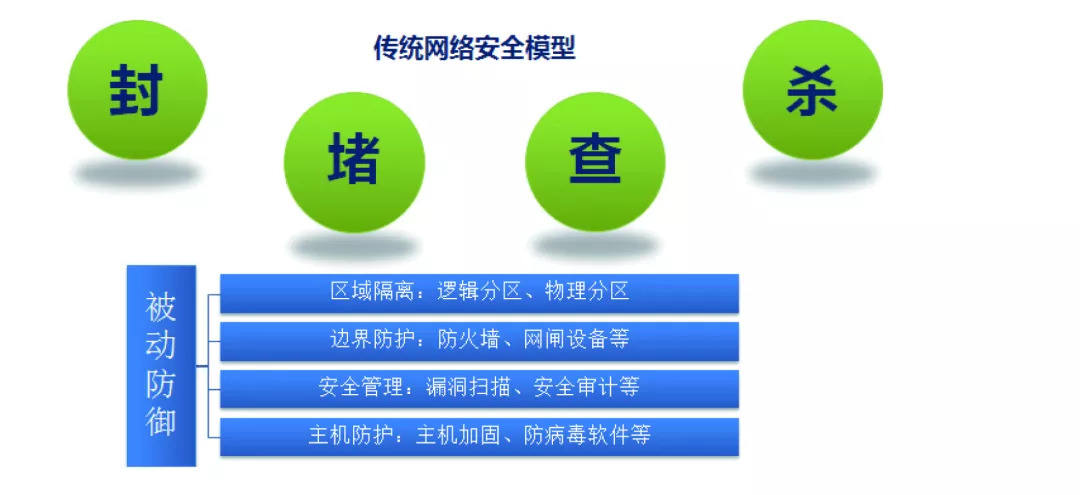 傳統(tǒng)的信息安全防護(hù)機(jī)制通過(guò)對(duì)關(guān)鍵網(wǎng)絡(luò)節(jié)點(diǎn)和數(shù)據(jù)出入口采取必要的訪問(wèn)控制和權(quán)限控制來(lái)達(dá)到信息安全防護(hù)的目的。傳統(tǒng)的被動(dòng)式防護(hù)體系主要采用“封”、“堵”、“查”、“殺”的策略對(duì)保護(hù)系統(tǒng)環(huán)境進(jìn)行安全過(guò)濾,主要依賴以下防護(hù)手段實(shí)現(xiàn):