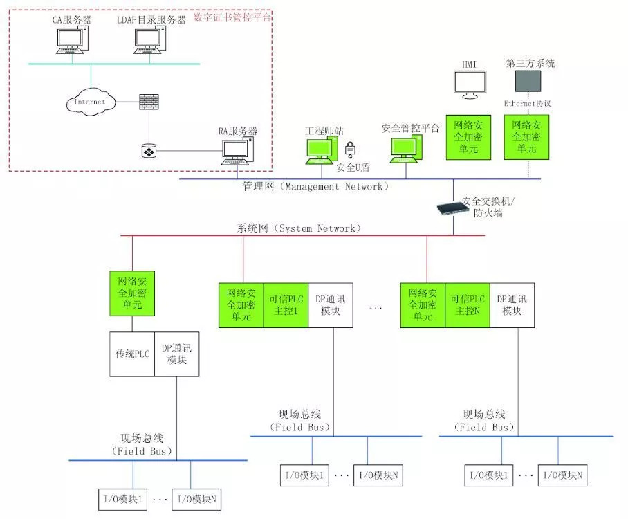 通過(guò)在現(xiàn)有工業(yè)控制系統(tǒng)的拓?fù)浠A(chǔ)上,增加可離線運(yùn)行的數(shù)字證書(shū)管理平臺(tái)、高度集成的安全管控平臺(tái)以及集成主動(dòng)安全防護(hù)技術(shù)的核心安全控制器,構(gòu)筑能夠?qū)σ阎{、未知威脅、外部非法訪問(wèn)、內(nèi)部非法接入等各類信息安全威脅的核心抵御能力。