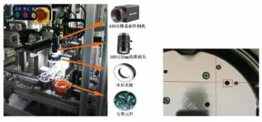 海螺8是海康威視工廠生產(chǎn)的一款攝像頭,其裝配需完成前蓋定位、泡棉上料、透鏡定位安裝、燈板定位安裝鎖附、前端組件定位安裝鎖附等一系列動作,整個過程應(yīng)用了大量機器人與機器視覺聯(lián)合定位引導(dǎo)。如圖4左所示的燈板鎖附工位負責燈板鎖附過程中螺釘?shù)膩砹隙ㄎ慌c引導(dǎo)安裝,由于設(shè)備安裝空間的局限性,項目中選擇了空間需求更小、工位更加節(jié)省、安裝更靈活的活動相機方式。海康威視自主研發(fā)生產(chǎn)的600萬像素面陣相機配合25mm焦距的500萬鏡頭,連同環(huán)形LED光源安裝在機械臂末端,隨同機械臂一同運動。