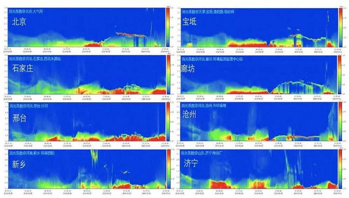 在2017年9月實施的“大氣重污染成因與治理攻關項目(總理基金)”中,中國科學院安徽光學精密機械研究所聯合國內其他院所高校在京津冀地區建立了16個地基立體觀測站點,開展了基于激光雷達等儀器的顆粒物立體探測研究。圖6為2017年12月25-30日激光雷達觀測的一次污染過程。12月27日下午京津冀地區污染物主要分布在1km以下,28日高空1km污染團與近地面污染混合,污染過程持續,28日夜間-29日凌晨,混合層高度降低,局地污染加劇至30日,30日下午混合層抬升,風速增大,擴散條件轉好,污染消散。地基單點固定式激光雷達的長期觀測十分必要,對于研究和統計分析一些重要大氣成分的變化規律具有重要價值。但車載、船載和機載式的可移動式平臺,機動性強,更適合應急和特殊環境的觀測,如機載式和船載式可以在海洋上空觀測,其觀測資料更能代表區域性大氣成分的分布。總之,多平臺、多類型雷達的聯合運用,在一些區域性乃至全球性大氣輻射和環境研究的對比實驗中發揮了重要作用。