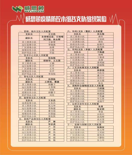 自疫情發生以來,市、區黨委政府和集團黨委高度重視,多次指導、督促公司開展疫情防控工作。1月26日開始,威思頓領導班子第一時間即著手研究、策劃疫情防控工作。根據集團公司黨委統一部署,威思頓成立了以董事長總經理為組長、領導班子其他成員為副組長、各部門負責人為組員的疫情防控領導小組,下設11個支隊、每個支隊下設5個小隊。雙管齊下,統籌安排,一手強抓人員排查、門禁管理、日常防控、應急管理等疫情防控工作落實,一手強化安全生產管理,嚴控各項風險,確保公司穩定運營和安全生產。