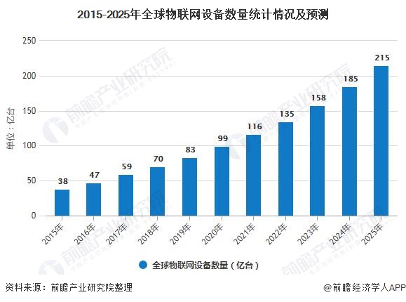 2015年全球物聯網設備數量僅僅38億臺。截止至2018年底全球聯網設備數量已經超過170億,扣除智能手機、平板電腦、筆記本電腦或固定電話等連接之外,物聯網設備數量達到70億臺。預測2019年全球物聯網設備數量將達83億臺。并預測在2025年全球物聯網設備數量將突破200億臺。