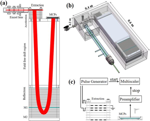 該團(tuán)隊(duì)唐小鋒副研究員和溫作贏博士等人,以真空紫外放電燈作為電離源,自行設(shè)計(jì)和研制了小型真空紫外光電離反射式飛行時(shí)間質(zhì)譜儀,并將之應(yīng)用于大氣自由基反應(yīng)動力學(xué)研究。通過設(shè)計(jì)具有籠式結(jié)構(gòu)的新型聚焦電場,實(shí)現(xiàn)了電離區(qū)內(nèi)離子的高效率收集,提高了質(zhì)譜儀的檢測靈敏度(自由基靈敏度達(dá)到0.3ppb)。同時(shí),通過采用垂直引入式結(jié)構(gòu)和二級空間聚焦等關(guān)鍵技術(shù),實(shí)現(xiàn)小型化質(zhì)譜儀高的質(zhì)譜分辨本領(lǐng)(M/△M = 2000, FWHM)。
