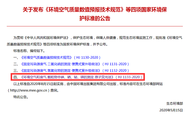 為貫徹《中華人民共和國環(huán)境保護法》和《中華人民共和國大氣污染防治法》,進一步完善國家生態(tài)環(huán)境保護標準體系,近日,生態(tài)環(huán)境部發(fā)布四項國家生態(tài)環(huán)境保護標準,其中《環(huán)境空氣和廢氣 顆粒物中砷、硒、 鉍、銻的測定 原子熒光法》(HJ 1133-2020),規(guī)范了環(huán)境空氣和廢氣顆粒物中砷、硒、鉍、銻的測定方法。該標準為首次發(fā)布,自2020年8月15日起實施。