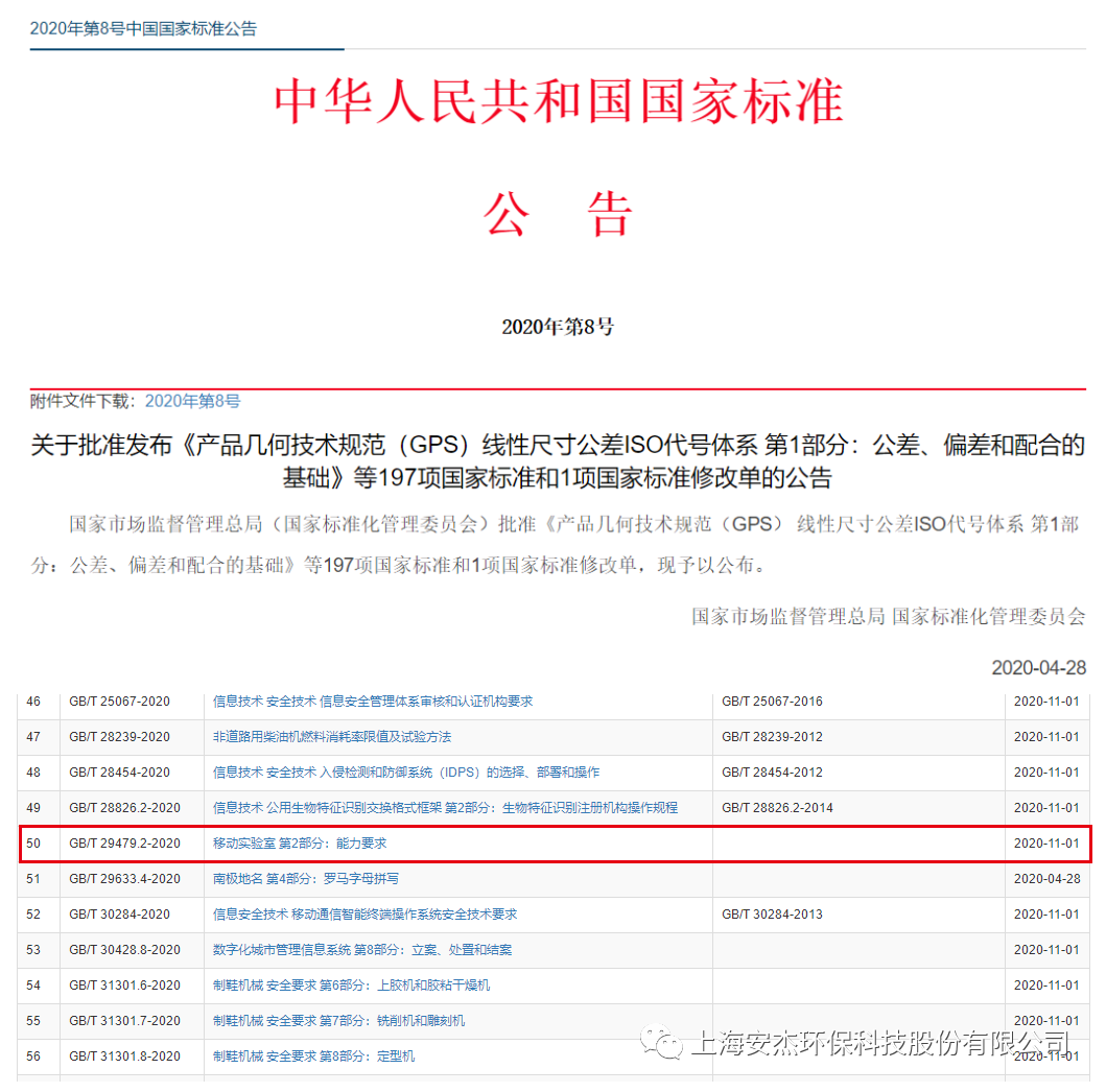 2020年04月28日,國家市場監(jiān)督管理總局國家標準化管理委員會發(fā)布了2020年第8號中國國家標準公告,《GB/T29479.2-2020 移動實驗室 第二部分:能力要求》獲得批準發(fā)布。