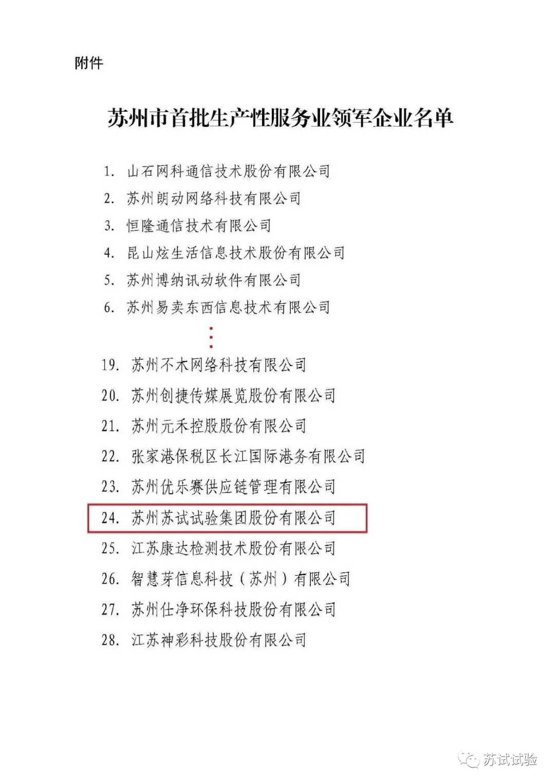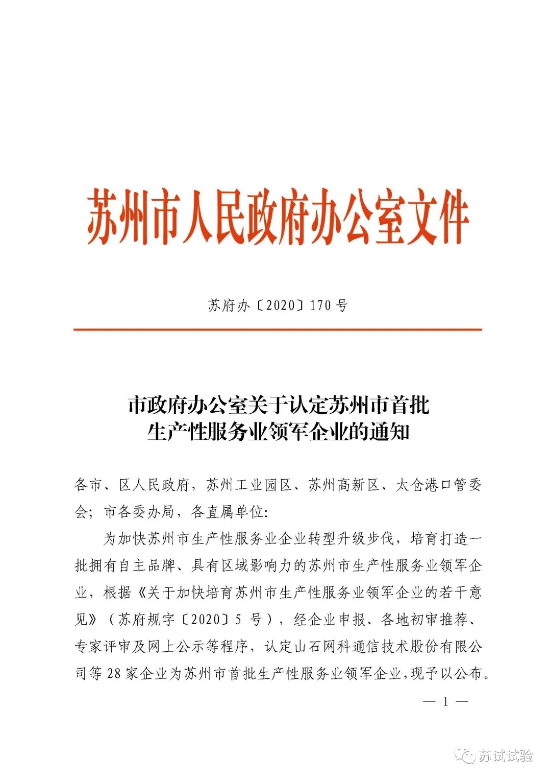 近日,蘇試試驗榮獲“蘇州市首批生產性服務業領軍企業”。