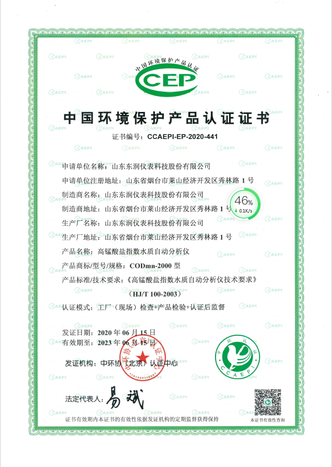 2020年6月20日山東東潤儀表科技股份有限公司通過在北京環(huán)境監(jiān)測總站無故障運(yùn)行3個月,喜獲CODmn-2000高錳酸鹽指數(shù)水質(zhì)自動分析儀環(huán)保認(rèn)證證書!