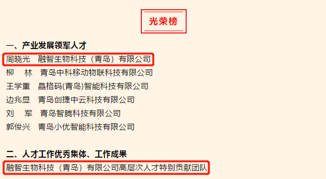近日,山東省青島市城陽區(qū)人才工作領(lǐng)導(dǎo)小組辦公室公布了2020年城陽優(yōu)秀人才、集體和工作成果入選名單,融智生物董事長周曉光入選該名單產(chǎn)業(yè)發(fā)展領(lǐng)軍人才獎項,同時融智生物入選該名單人才工作優(yōu)秀集體、工作成果獎項。