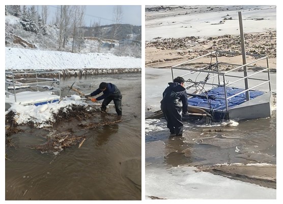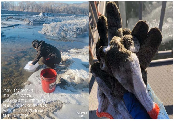 河北省承德市郭家屯、李臺站運維人員黃可新、高凌立對水站進行巡檢時,發(fā)現(xiàn)采水口附近堆積了大量樹枝雜物,他們毫不猶豫,穿著水褲下入河水,刨開冰雪清理雜物。雖然腳下的河水冰冷,但是他們的熱情高漲,保證數(shù)據(jù)“真、準(zhǔn)、全”,他們認(rèn)為一切都是值得的。