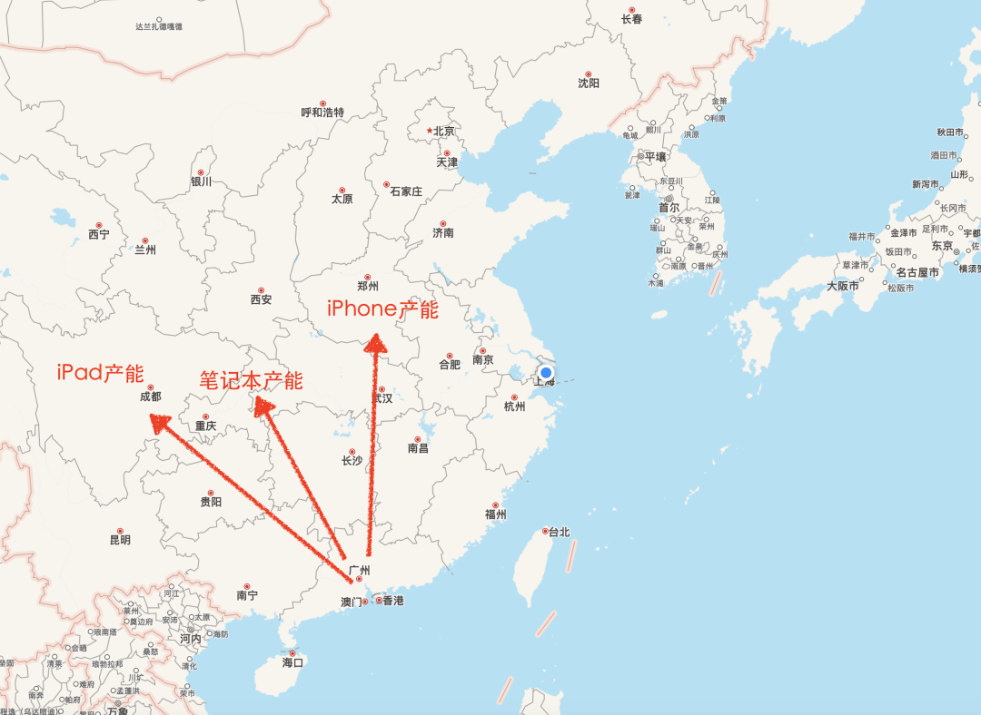 結(jié)果就是,電子產(chǎn)業(yè)鏈雖然部分離開我國東部沿海,但又大部分被中西部承接:四川生產(chǎn)了全球70%的iPad,河南生產(chǎn)了一半以上的iPhone,重慶則包攬了40%的筆記本電腦。三個省市的電子工業(yè)產(chǎn)值合計超過2萬億,相當(dāng)于整個越南的GDP。