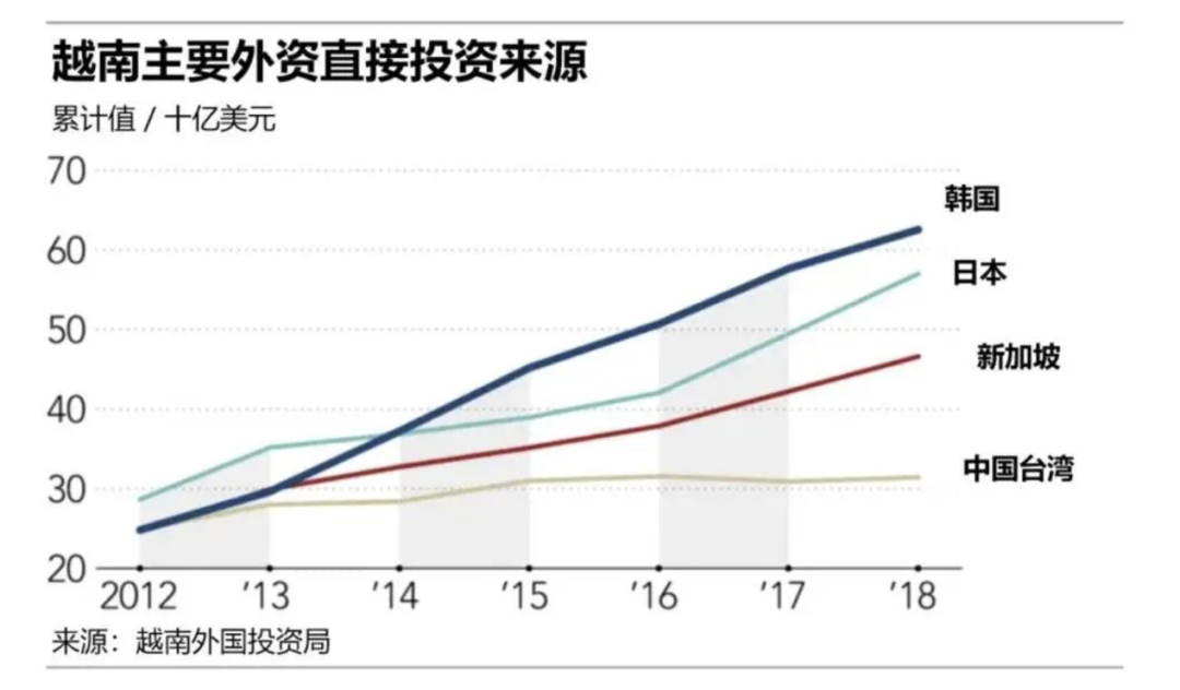 東亞金融危機(jī)后,日本經(jīng)濟(jì)總量原地打轉(zhuǎn)了整整近20年,而韓國卻從尸山血海中爬起來后,開始迅猛增長,超過俄羅斯成為了世界第八大工業(yè)國,人均GDP也達(dá)到了日本的7成。但狹小的韓國本土無法承載迅猛崛起的韓國企業(yè),南下成為了必然的選擇。2014年,韓國超越日本,成為越南最大的FDI來源國。