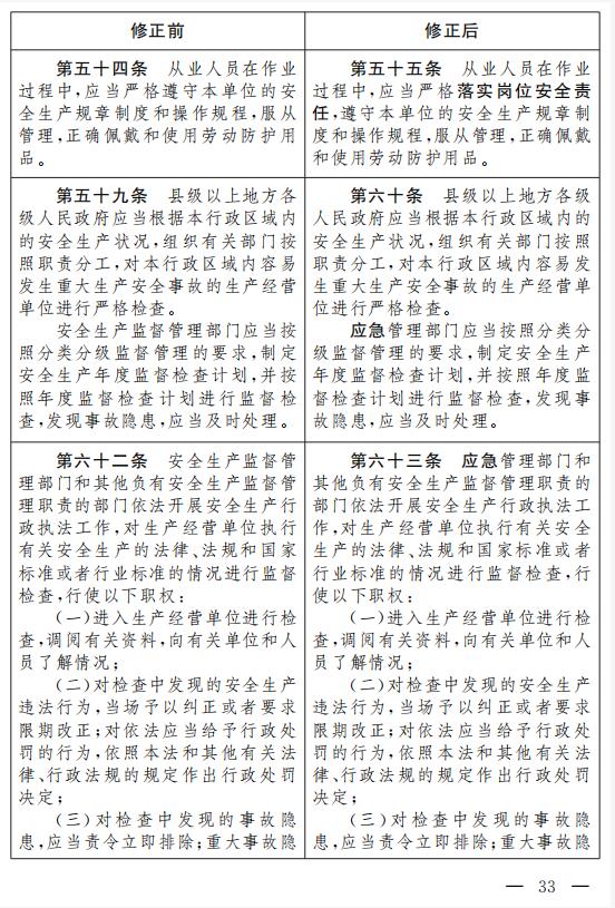 十五、將第五十四條改為第五十五條,修改為:“從業人員在作業過程中,應當嚴格落實崗位安全責任,遵守本單位的安全生產規章制度和操作規程,服從管理,正確佩戴和使用勞動防護用品。”
