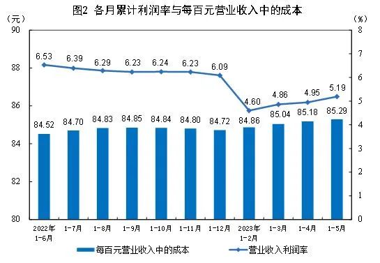 15月份,規(guī)模以上工業(yè)企業(yè)實(shí)現(xiàn)營(yíng)業(yè)收入51.39萬(wàn)億元,同比增長(zhǎng)0.1%;發(fā)生營(yíng)業(yè)成本43.83萬(wàn)億元,增長(zhǎng)1.2%;營(yíng)業(yè)收入利潤(rùn)率為5.19%,同比下降1.21個(gè)百分點(diǎn)。
