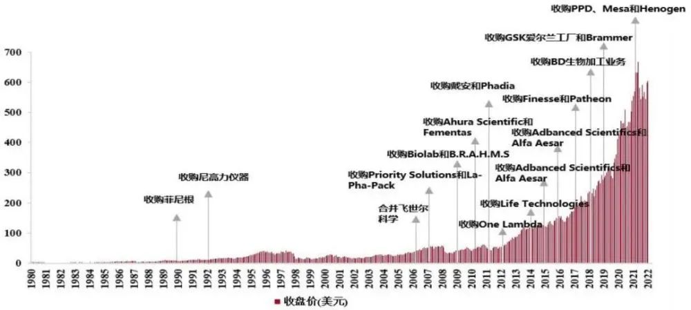 對(duì)于并購(gòu)標(biāo)的的選擇尤其偏愛(ài)細(xì)分龍頭。比如2011年以21億美元收購(gòu)美國(guó)戴安公司,成為色譜行業(yè)領(lǐng)先者;2021年,174億美元收購(gòu)PPD,躋身全球CRO行業(yè)TOP 5。
