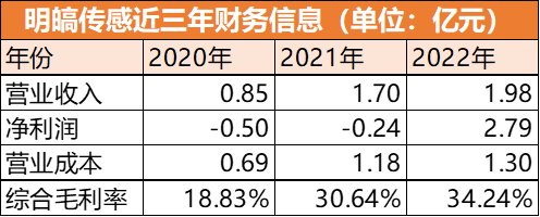 據(jù)了解,明皜傳感主要從事MEMS傳感器研發(fā)、設(shè)計和銷售的芯片設(shè)計。其招股書顯示2020年、2021年及2022年財務(wù)信息如下(注:訂正2022年凈利潤為0.28):