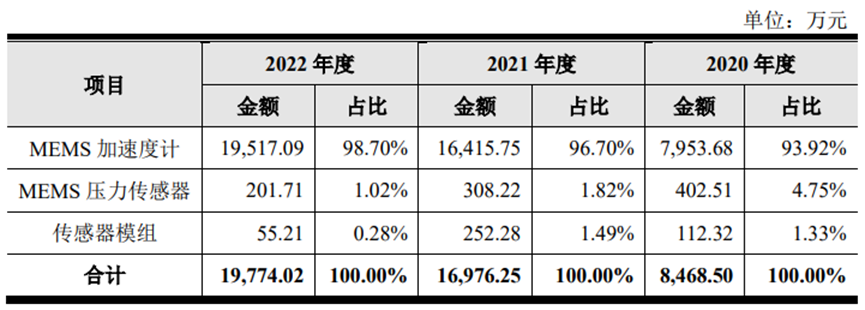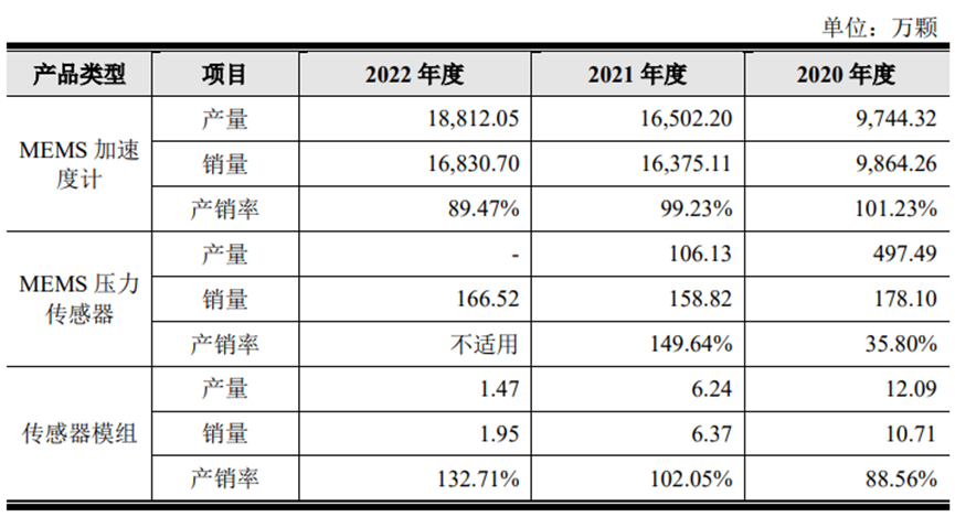 按以上各產(chǎn)品營收來看,目前占比最大的是MEMS加速度計,占比98.70%。同樣,該產(chǎn)品的產(chǎn)銷量也最高。