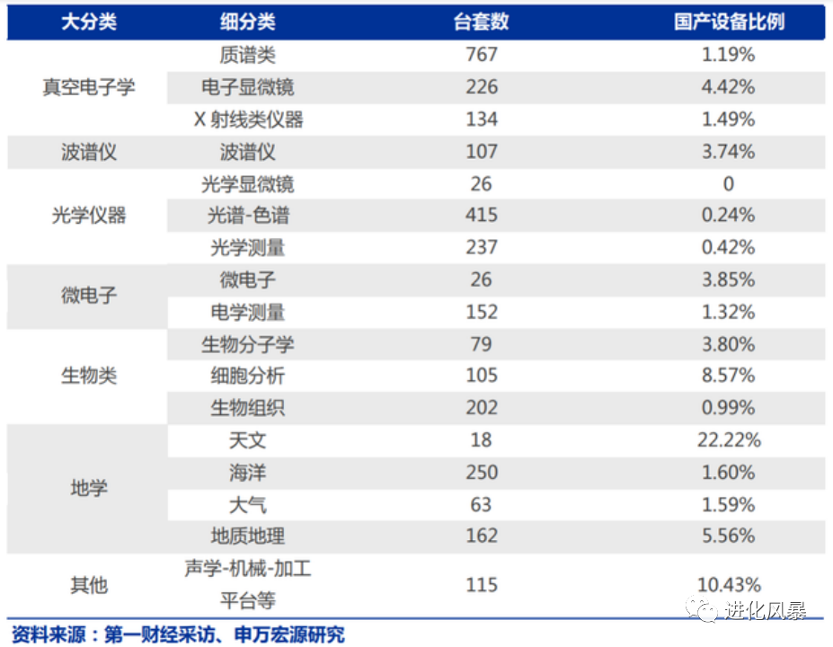 2016-2019 年間,中科院下屬研究所采購的200萬以上的科學儀器中,國產質譜儀、X 射線類儀器、光學色譜儀、光學顯微鏡比例不足 1.5%,其中,光學顯微鏡國產采購率為0。類似核磁共振波譜儀、液質聯用儀、X射線衍射儀的“國貨”占比率,僅為0.99%、1.19%、1.32%。