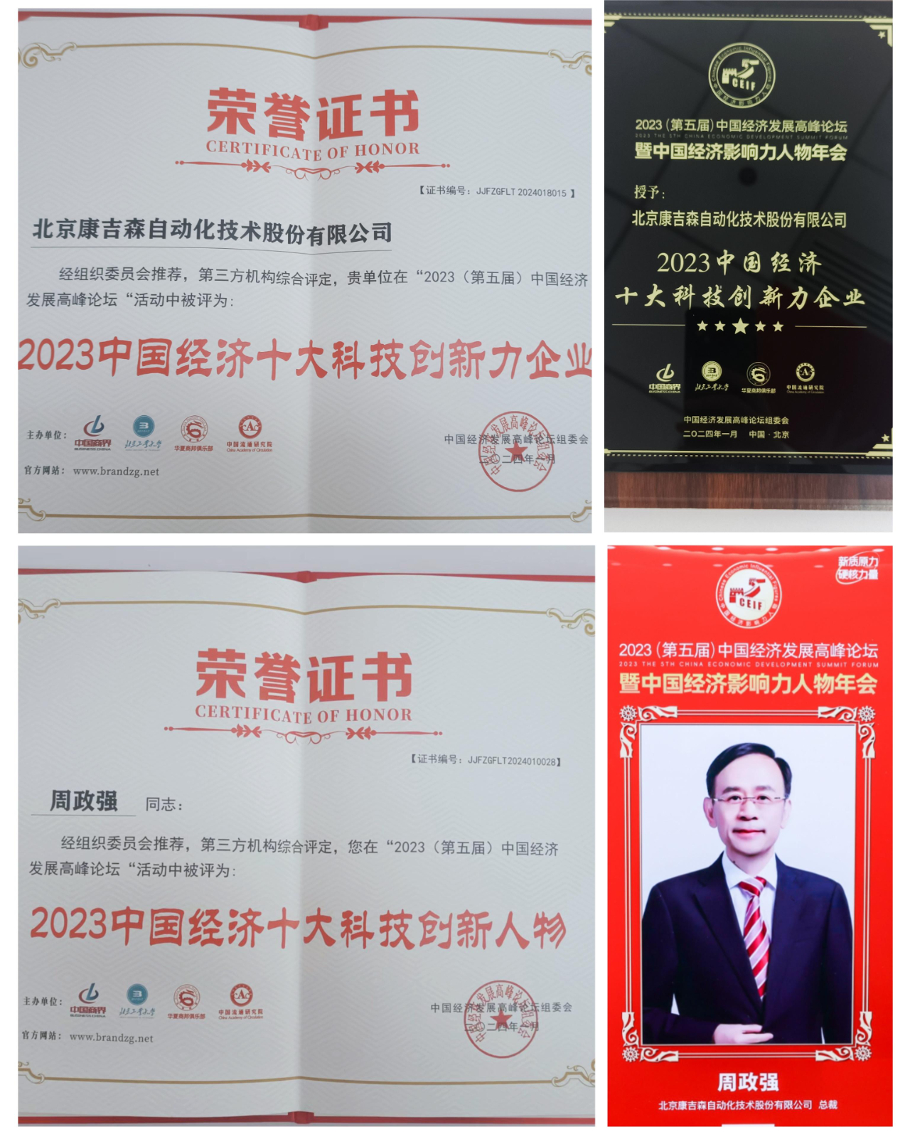 康吉森股份總裁、北京康吉森科技董事長周政強榮獲“2023中國經濟科技創新力人物”獎