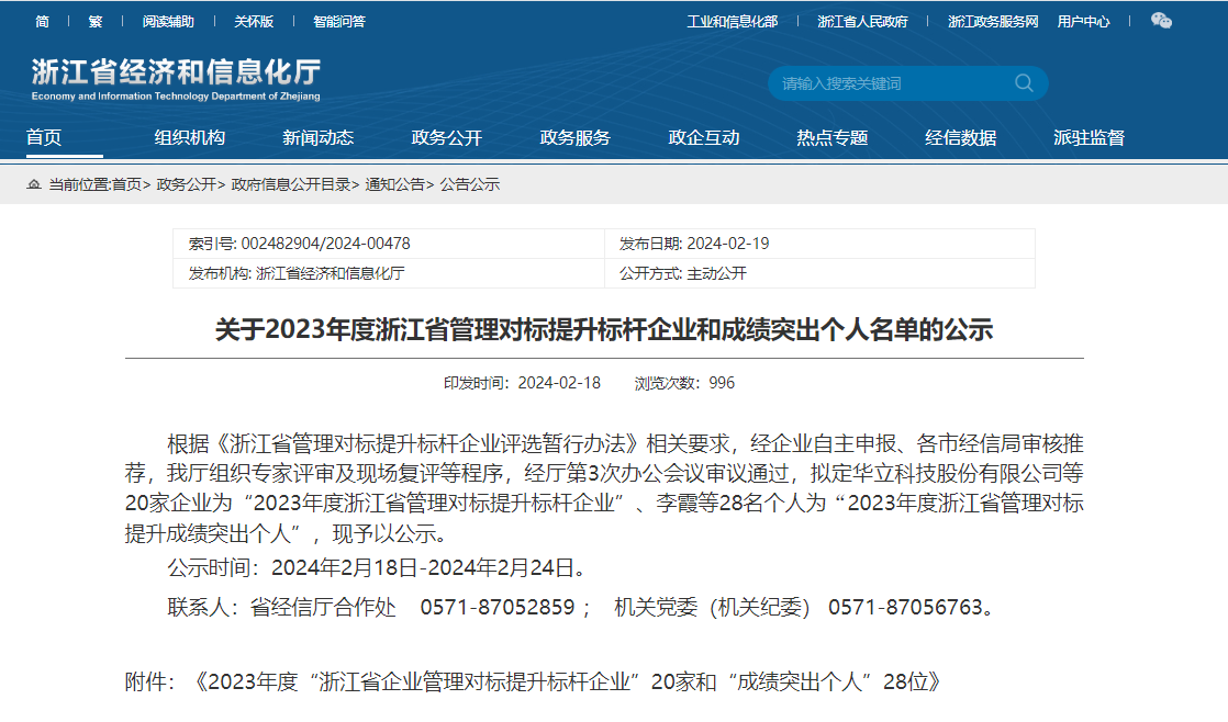 近日,浙江省經(jīng)信廳公布了“2023年度浙江省管理對標(biāo)提升標(biāo)桿企業(yè)名單”,全省共有20家企業(yè)入選。其中,華立科技成功躋身杭州市兩家入選企業(yè)之一,獲評“2023年度浙江省管理對標(biāo)提升標(biāo)桿企業(yè)“稱號。