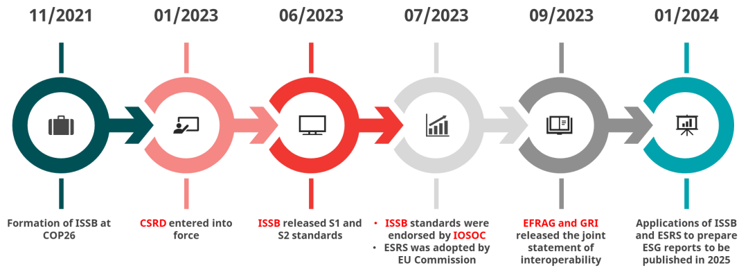 * 2023年7月,國際證監(jiān)會(huì)組織(IOSCO)發(fā)布聲明認(rèn)可ISSB標(biāo)準(zhǔn),意味著很多國家的證券交易所將采用ISSB標(biāo)準(zhǔn)。