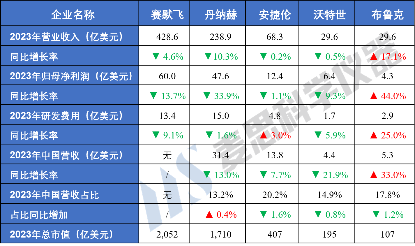 截至2024年2月,賽默飛、丹納赫、安捷倫、沃特世和布魯克已發(fā)布2023年年報。重點財務(wù)數(shù)據(jù)如下: