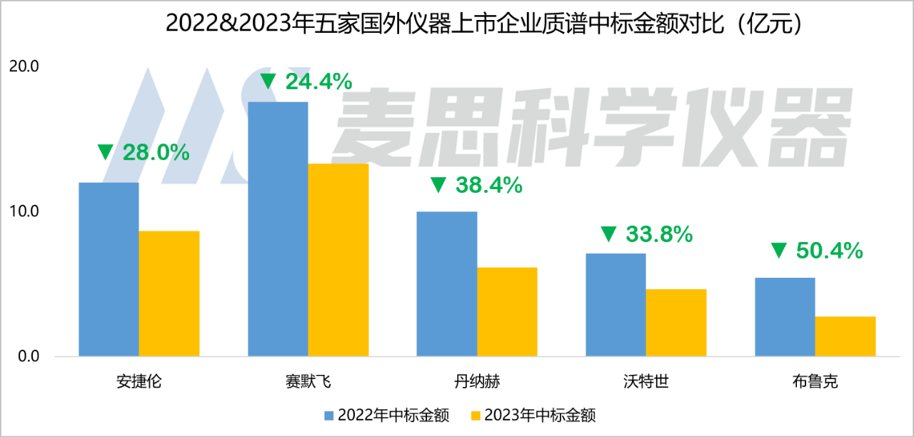 從中標數(shù)據(jù)來看,雖然2023年上述五家國外企業(yè)進入了中國質(zhì)譜儀器中標市場的TOP 10廠商行列,但他們中標數(shù)量和中標金額同比都有比較明顯的下降。