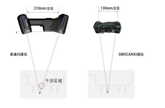 擺在研發(fā)團(tuán)隊(duì)面前的第一個(gè)難題是:如何在縮短相機(jī)基線的情況下,確保高精度?SIMSCAN體積小,相應(yīng)地,相機(jī)基線距離比普通掃描儀更短。面對(duì)這一變化,研發(fā)團(tuán)隊(duì)采用圖像增強(qiáng)等技術(shù)和全新的亞像素特征提取算法,很大程度改善設(shè)備精度,并重新設(shè)計(jì)了基于短基線的標(biāo)定系統(tǒng);同時(shí)利用相機(jī)夾角變小的特性,提高了深孔、流道、凹槽、縫隙等狹小特征的掃描能力。