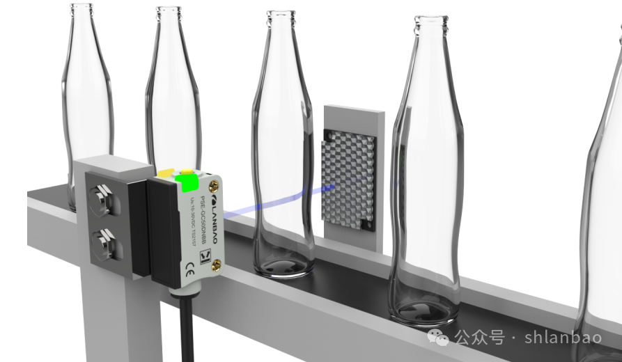 通過計數(shù)來檢查和控制產(chǎn)品流是飲料工廠對產(chǎn)品包裝的一項典型應用。在飲料工業(yè)生產(chǎn)中,制造瓶子時將生產(chǎn)出多樣的產(chǎn)品變型,其輸送過程的循環(huán)速率較高,為實現(xiàn)快速流暢的運輸,需要可靠地識別瓶子,由于它們的形狀和表面情況多變、傳輸速度較高、光學特性復雜,實現(xiàn)穩(wěn)定準確檢測尤為困難。蘭寶PSE-GC50系列光電傳感器可靠檢測透明物體,無論是薄膜、托盤、玻璃瓶、塑料瓶還是薄膜斷裂,PSE-GC50都能可靠地進行識別,不漏檢,對各種透明物體穩(wěn)定檢測,大大提升流水線工作效率。