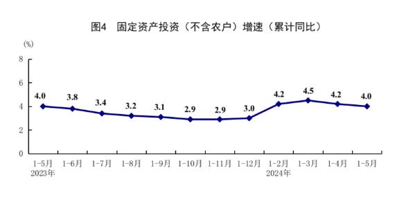 1-5月份,全國固定資產投資(不含農戶)188006億元,同比增長4.0%;扣除房地產開發投資,全國固定資產投資增長8.6%。分領域看,基礎設施投資同比增長5.7%,制造業投資增長9.6%,房地產開發投資下降10.1%。全國新建商品房銷售面積36642萬平方米,同比下降20.3%;新建商品房銷售額35665億元,下降27.9%。分產業看,第一產業投資同比增長3.0%,第二產業投資增長12.5%,第三產業投資同比持平。民間投資增長0.1%;扣除房地產開發投資,民間投資增長6.9%。高技術產業投資同比增長11.5%,其中高技術制造業和高技術服務業投資分別增長10.4%14.3%。高技術制造業中,航空、航天器及設備制造業,電子及通信設備制造業投資分別增長53.1%10.4%;高技術服務業中,電子商務服務業、信息服務業投資分別增長32.5%19.1%5月份,固定資產投資(不含農戶)環比下降0.04%