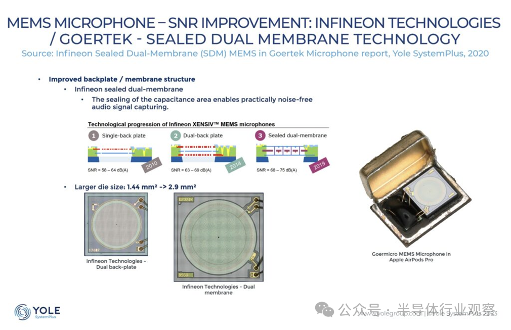 從設(shè)計(jì)和材料角度來看,MEMS 廠商正在不斷創(chuàng)新,以提高其設(shè)備的性能。例如,英飛凌科技在蘋果 Airpods Pro 的歌爾 MEMS 麥克風(fēng)中采用了密封雙膜技術(shù),顯著提高了 SNR 性能。