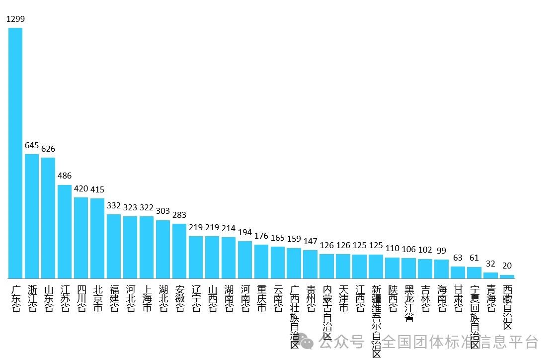 截至2024630日,廣東省、浙江省、山東省、江蘇省等31個省、自治區、直轄市的社會團體在全國團體標準信息平臺注冊,其中廣東省社會團體注冊數最多,為1299家,占社會團體注冊總數的14.3%。