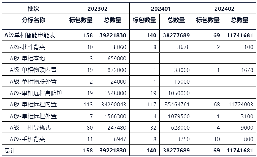 A級單相分標總數量1174萬只、69個標包。