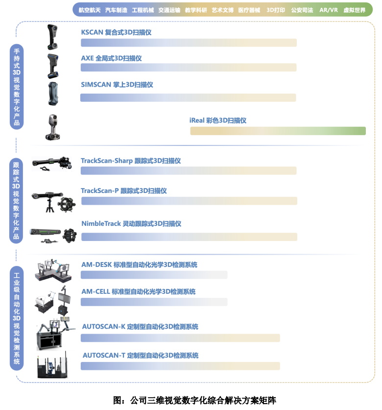 思看科技成立于2015年,公司控股股東和實際控制人均為王江峰、陳尚儉、鄭俊。公司是面向全球的三維視覺數字化綜合解決方案提供商,主營業務為三維視覺數字化產品及系統的研發、生產和銷售。公司深耕三維視覺數字化軟硬件專業領域多年,逐步在關鍵光學部件、核心3D視覺算法、高性能硬件結構設計、3D掃描及分析對比軟件等主要方面積累了豐富的技術能力,搭建起較為完善的三維視覺數字化技術平臺,并基于此不斷開發適應領域廣泛、通用性強的創新產品。目前公司產品主要覆蓋工業級和專業級兩大差異化賽道,涵蓋便攜式3D視覺數字化產品、跟蹤式3D視覺數字化產品、專業級彩色3D視覺數字化產品和工業級自動化3D視覺檢測系統等產品。