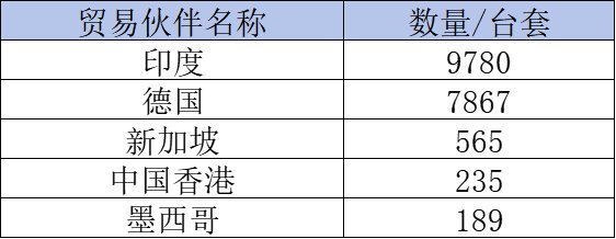2024年上半年質(zhì)譜出口18994臺(tái)套,數(shù)量前五的有印度9780臺(tái)套,德國7867臺(tái)套,新加坡565臺(tái)套,遠(yuǎn)銷中國香港235臺(tái)套,墨西哥189臺(tái)套。
