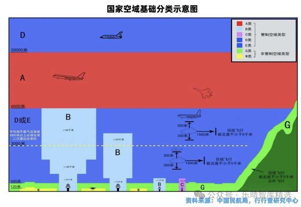 202312月民航局發(fā)布的《國(guó)家空域基礎(chǔ)分類方法》中,將空域劃分為ABCDEGW7類,其中,ABCDE類為管制空域,GW類為非管制空域。