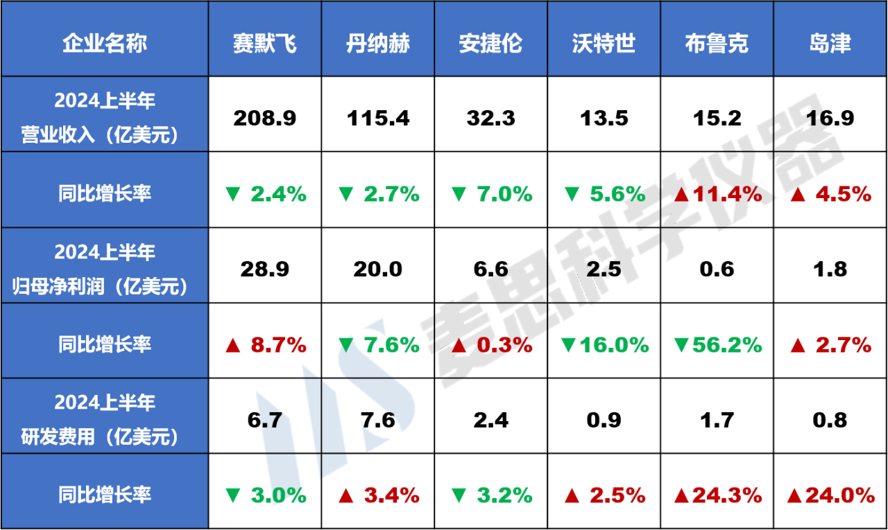 截至2024年8月,賽默飛、丹納赫、安捷倫、沃特世、布魯克和島津已發(fā)布2024上半年財(cái)務(wù)數(shù)據(jù)。重點(diǎn)財(cái)務(wù)數(shù)據(jù)如下: