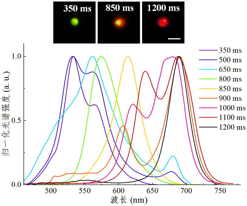 利用超快激光誘導(dǎo)的納米液相分離過程可以實(shí)現(xiàn)納米晶的發(fā)光帶隙的直寫調(diào)控,該技術(shù)方案允許在同一片玻璃內(nèi)部直寫發(fā)光波長組合可調(diào)的納米晶圖案,可用于多維的信息編碼和防偽。如圖3(a)~(c)所示,通過該技術(shù)可以在玻璃內(nèi)部直寫綠色、黃色和紅色的浙江大學(xué)校徽。在此基礎(chǔ)上,使用不同的激光參數(shù)在對(duì)應(yīng)鹵素?fù)诫s玻璃中可以實(shí)現(xiàn)彩色圖案的直寫。