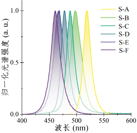 除A位鹵素陰離子帶隙可控的納米晶直寫外,研究人員在B位Cd/Pb陽離子體系證明了該方法可以調(diào)控玻璃中局部的納米液相分離和離子交換過程,并有效的控制元素的重新分布并調(diào)控局部化學(xué)成分。通過優(yōu)化脈沖持續(xù)時(shí)間、重復(fù)頻率和脈沖能量以及玻璃組分中Cd/Pb的比例,在含銫、鉛、鎘和鹵化物元素的硼硅酸鹽玻璃中實(shí)現(xiàn)了超快激光誘導(dǎo)CsPbxCd1-xBr3納米晶析出,其發(fā)光波長可調(diào)范圍為461 nm~514 nm(圖2)。