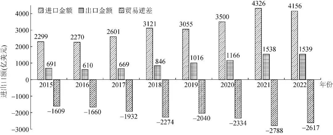 2022年中國(guó)集成電路的進(jìn)出口量顯著下降,但進(jìn)出口產(chǎn)品價(jià)值卻大幅提升。根據(jù)海關(guān)總署的數(shù)據(jù)顯示,2022年中國(guó)集成電路進(jìn)口數(shù)量總額5384億塊,同比下降15.3%①;出口數(shù)量總額2734億塊,同比下降12%;貿(mào)易逆差2650億塊,同比下降18.4%。