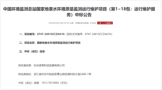 2024919日,中國環境監測總站國家地表水環境質量監測運行維護項目發布中標公告,杭州譜育科技發展有限公司(以下簡稱譜育科技)成功中標包件4,中標金額1912.78萬元。本次中標包件含102個國控水站運行維護及201個國控斷面采測服務工作,服務范圍覆蓋云南省、四川省、西藏自治區。