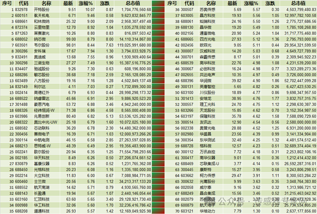 具體到中國傳感器產(chǎn)業(yè)鏈,70只傳感器核心產(chǎn)業(yè)鏈企業(yè)中,全部上漲,無一家傳感器上市股票下跌——歷史罕見。70只傳感器股票平均漲幅5.77%,總市值達到9453.23億元,而漲幅TOP 10傳感器股票的平均漲幅達到8.65%