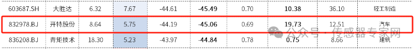 細分來看,國產(chǎn)汽車傳感器企業(yè)開特股份收盤報漲10.07%,領(lǐng)銜中國A股傳感器股票,市值17.05億元。