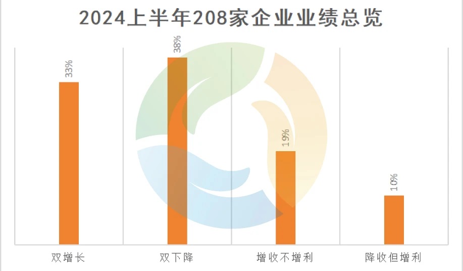 據(jù)統(tǒng)計,在已經(jīng)發(fā)布2024年半年度報告的208家上市環(huán)保企業(yè)中,有80家企業(yè)呈現(xiàn)出“雙降”的情況,也就是營業(yè)總收入和凈利潤相較同期都有所下降。