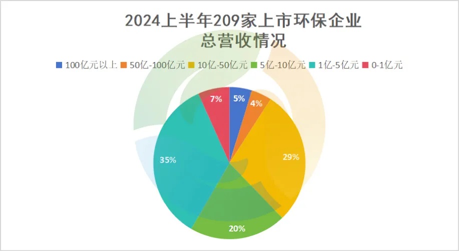10家環(huán)保企業(yè)進入總營收“百億俱樂部”,占比達5%;此外還有9家環(huán)保企業(yè)總營收處于50-100億元,占比達4%。也就是說,在2024上半年的210家上市環(huán)保企業(yè)中,9%的環(huán)保企業(yè)總營收超過50億元。