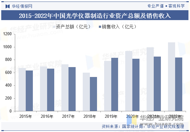 根據國家統計局數據,近年來我國光學儀器制造行業資產總額及銷售收入總體呈現出增長態勢,2015-2022年,行業資產總額由674.99億元增長至1072.58億元,CAGR6.84%,行業銷售收入由632.65億元增長至835.72CAGR4.06%